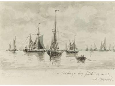 Vissersboten. Het drogen van de netten op zee